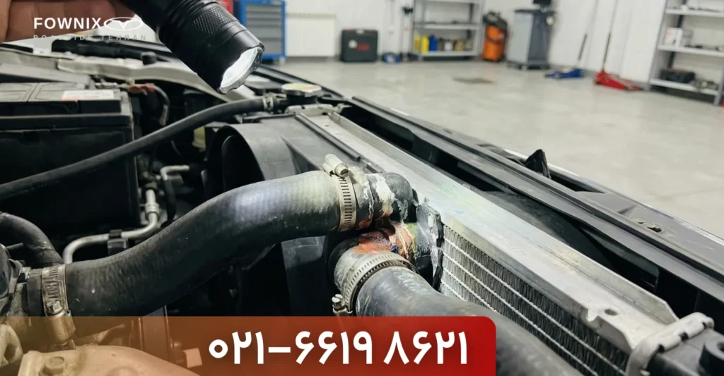 زیر خودرو و اطراف رادیاتور/شلنگ‌ها را نگاه کنید؛ لکه‌های خشک‌شده‌ی رنگی هم مهم‌اند.